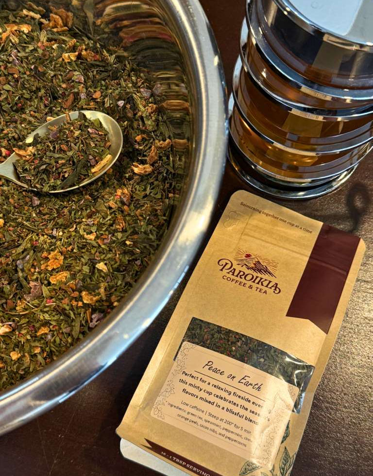 Ingredients are: green tea, spearmint, peppermint, cinnamon, orange peels, cocoa nibs, and pink peppercorns.